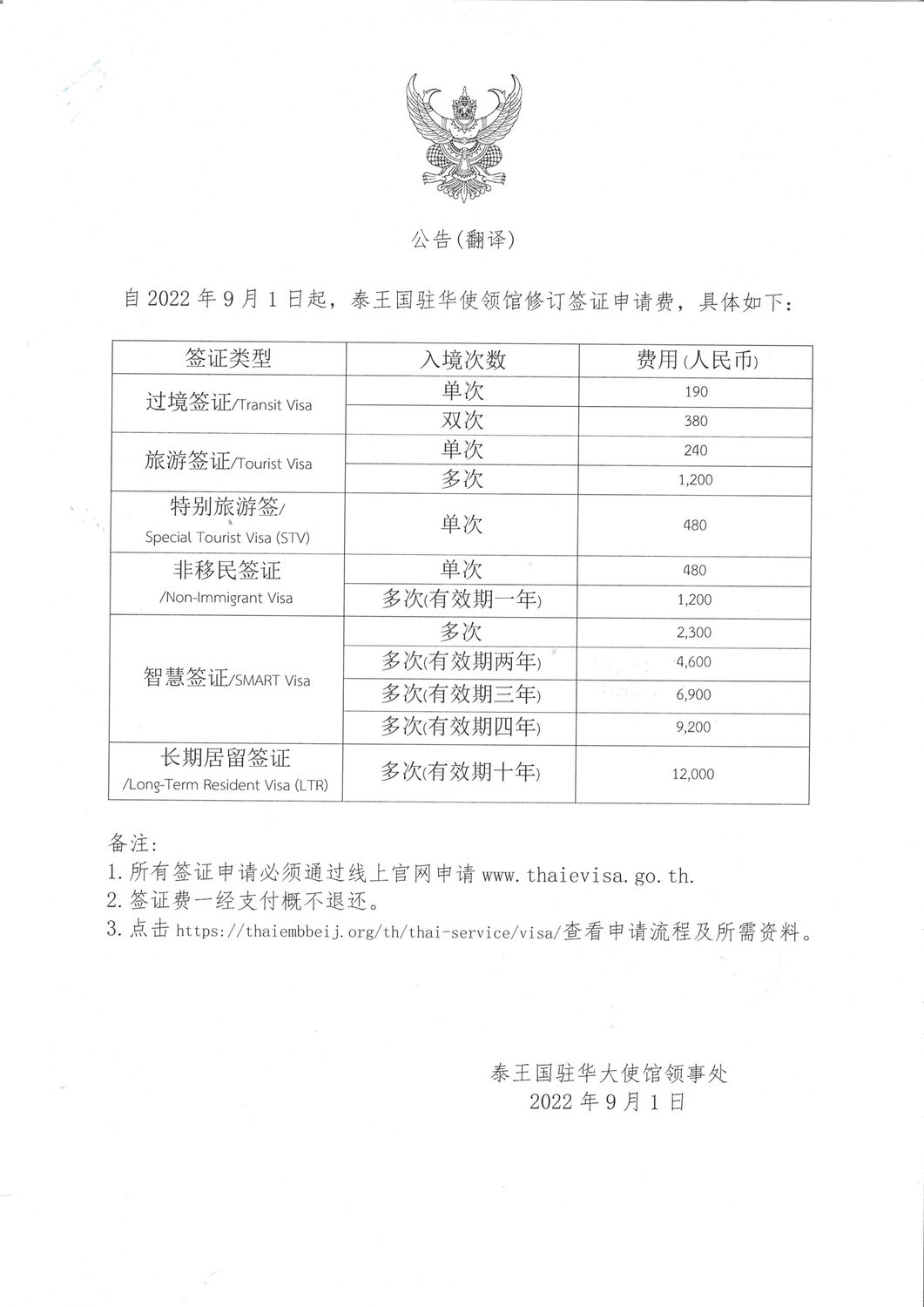 关于2022年9月1日泰国签证调整服务费公告